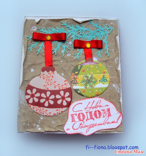 Совсем простые открытки на краф-бумаге, забрызганной белой краской. Вырубка-веточки, шарики... Правда, на первой открытке голографические шарики превратились в зимние вишенки
