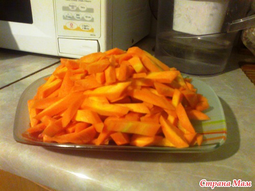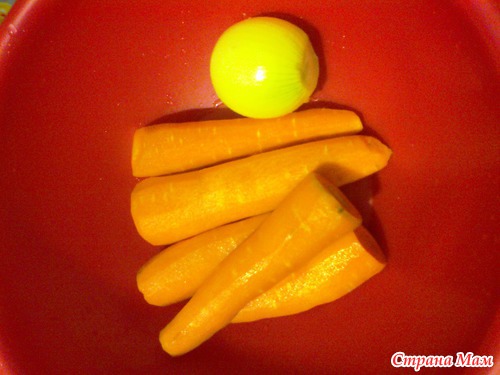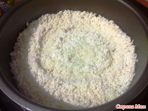 Следом добавляем морковь. Приправы, соль - по вкусу. Оставляем их жариться и идем за рисом (промываем рис несколько раз, пока не сойдет весь крахмал).