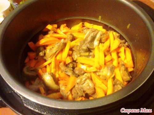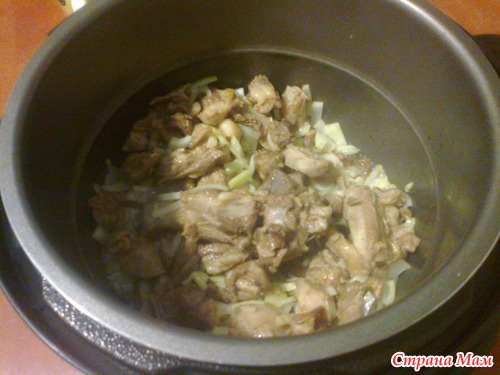Итак, приступим. На любом режиме с открытой крышкой жарите мясо. Без масла. Через несколько минут отправляем к мясу лук.