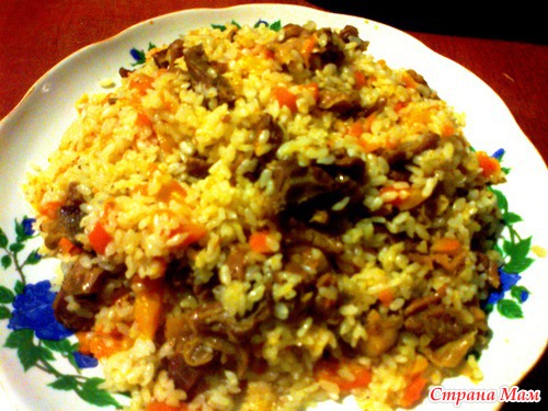 Вода. Соотношение рис:вода 2:1. Нет, не перепутала, все правильно. Воды потребуется ровно в 2 раза меньше, если хотите в итоге получить рассыпчатый плов.