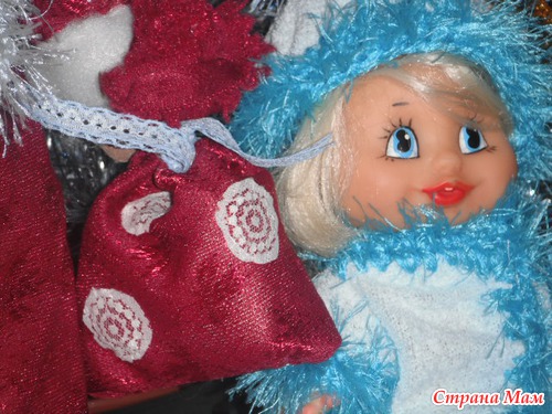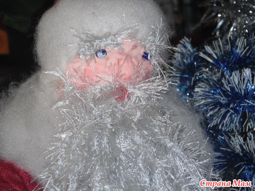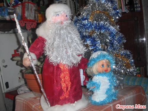 Стеклянная бутылка обтянутая красочной тканью, белый синтепон, нитки, крючок, обрезки гипюра, тесьма и Дед Мороз готов. Снегурочка - кукла, для которй просто сшита шубка из махровой футболки и связана опушка из "травки". Благодарю за внимание. Читать полностью