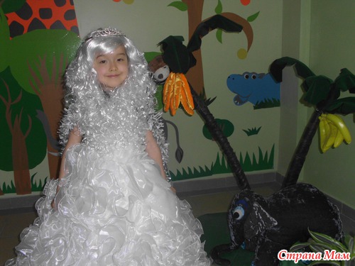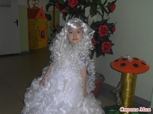 и мы решили купить красивое платье! Купили мы белоснежное платье с блестками. Потом я решила что образ снежной королевы не полный, и погуляв по интернету решила сделать костюму воротник с накидкой. Купили белый паричок, дождик, снежинки и я до поздней ночи мастерила воротник и накидку . Вот результат наших стараний