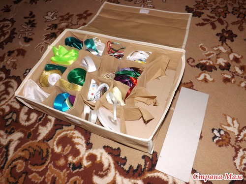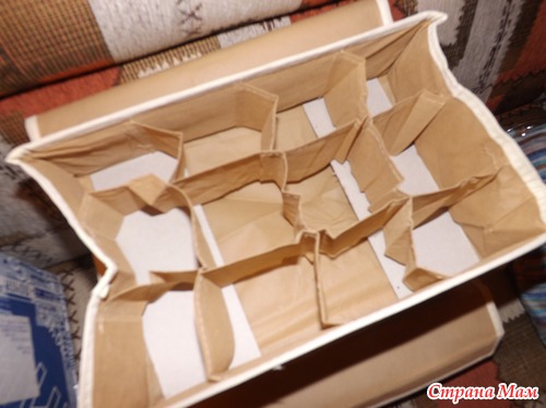 Потом я поняла, что ошиблась! Картонки вставляются в специальные кармашки в борта, что позволяет кофру несколько держать форму... Ещё я провела апгрейд кофров: отпорола ячейки сбоку, вырезала дно из жесткого картона (коробка посылочная), вставила в дно, потом ячейки пришила обратно. Сразу стало намного умнее! На фото видно отпоротые ячейки и картонка, которая должна вставляться в борт. Кофр оказался хорош для хранения ленточек, тесемочек и т. п.