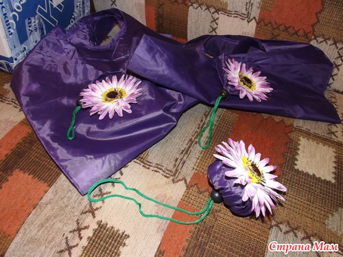 Сумочки хозяйственные для мамы, крестной и свекрови... Мелочь, но, думаю, такая сумочка посимпатичней, чем просто дежурный пакет для покупок... Приятно иметь такой цветочек в сумке на случай покупки продуктов, например. На переднем плане- сумочка в собранном виде.