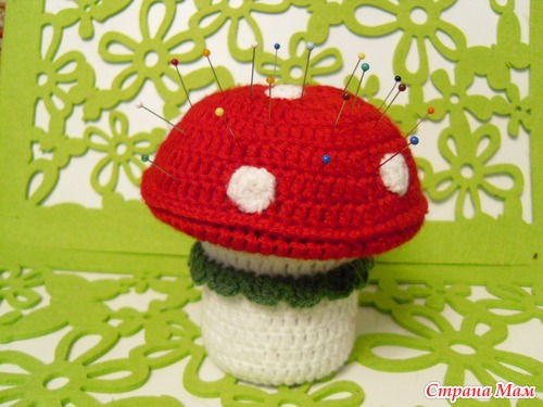 Делала подруге-коллеге по шитью. У нее весь ассортимент с такими грибами. Консервная банка из под горошка набита для устойчивости остатками ткани, чтобы не такая тяжелая была, но и нелегкая. СДишка, а по верху поролон.