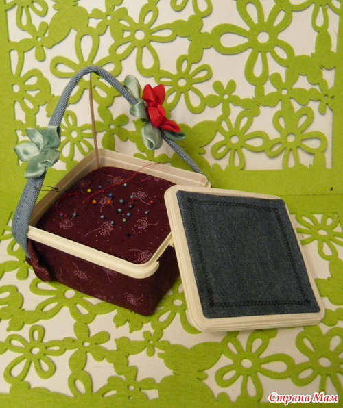 На крышку приклеила джинсу, так удобнее брать иголки пальцами, если их надо быстро наскладировать - не скользят по столу или тарелке.
