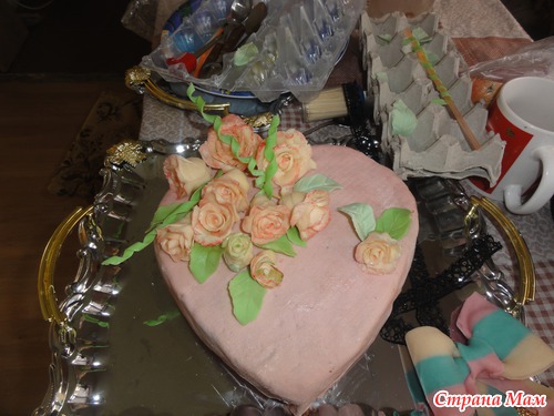 В эту группу я попала случайно год назад, долго смотрела и восхищалась работами и наконец в октябре решилась сделать свой первый тортик с мастикой! Повод для этого был - день рождение подруги. Торт бисквитный с кремом из взбитых сливок и творожка Даниссимо персиковго, прослойка - персики консервированные. Выравнивание, точнее попытка это сделать))) - ганаш на горьком шоколаде. Обтяжка - шокомастика, мне очень понравилась, лепится легко, вкусная. Красила мастику карандашами гелевыми, краска пришла уже позже. Сердце хотела более глубокого цвета, но к сожалению карандаши так не окрасили, хотя добавила много. Вот такой он - мой самый первый торт:
