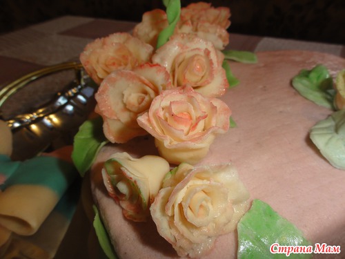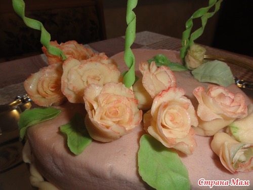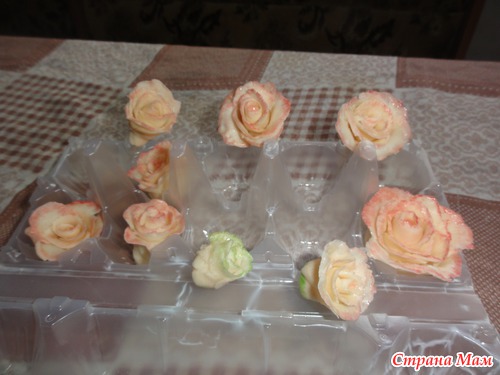 Это еще не совсем готовые розочки, специально добавляю фото, потому что хотелось бы услышать совет. Не смотря на то что шокомастика понравилась, у розочек край рваный. Почему? Вырезала крышкой из под растительного масла, формировала барабанной палочкой.