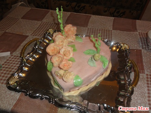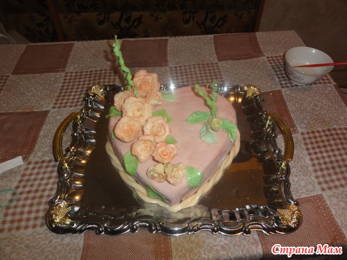 В эту группу я попала случайно год назад, долго смотрела и восхищалась работами и наконец в октябре решилась сделать свой первый тортик с мастикой! Повод для этого был - день рождение подруги. Торт бисквитный с кремом из взбитых сливок и творожка Даниссимо персиковго, прослойка - персики консервированные. Выравнивание, точнее попытка это сделать))) - ганаш на горьком шоколаде. Обтяжка - шокомастика, мне очень понравилась, лепится легко, вкусная. Красила мастику карандашами гелевыми, краска пришла уже позже. Сердце хотела более глубокого цвета, но к сожалению карандаши так не окрасили, хотя добавила много. Вот такой он - мой самый первый торт: