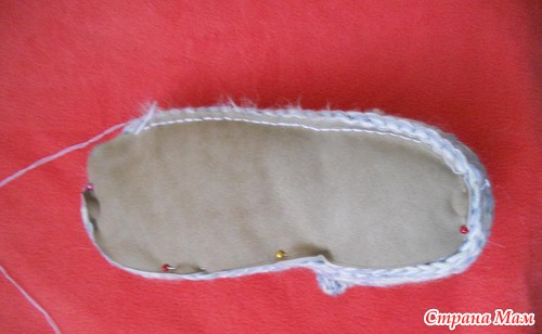 чтобы легче было пришивать подошву натяните связанную часть и подошву на тапок