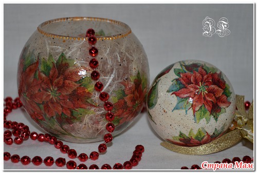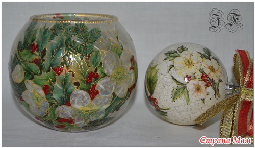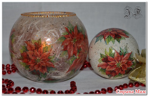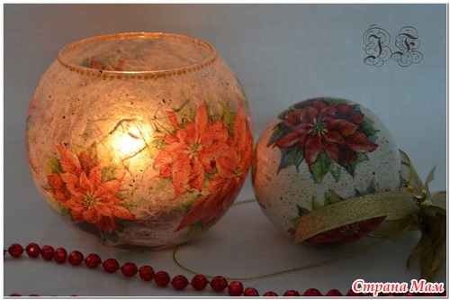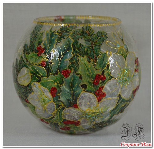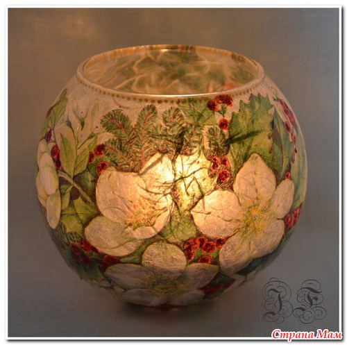Сначала стеклянная ваза-подсвечник обклеивается рисовой бумагой, а сверху уже салфетка - ну а дальше - на свое усмотрение