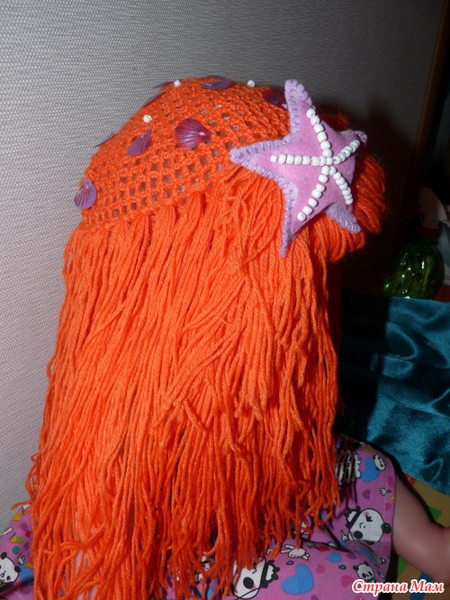 К нашему новогоднему костюму связалась шапочка. Шапочку вязала просто сеткой, 1ст\н, 2 в\п... Потом по низу в 3 ряда бахрома в 5 ниток нужной длинны( итого 10, 5 пополам). между рядами 5 рядов пропускаем. Верх шапки просто обшит ракушками-пайетками и бисером. Украшение - морская звезда из фетра.