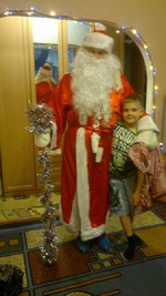 Маленькая доча(ей 2.3 года) сразу закричала "ПАПА, ПАПА"!!! Как она узнала-не понимаю, ведь открытыми от костюма были только глаза! Старший сын был ошарашен! Он стоял и смотрел на него, соображая настоящий он или нет! Но потом он даже спел песенку и получил подарок.