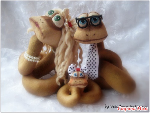 Вот такую змеиную семейку меня попросили изготовить в подарок на Новый год, были оговорены цвет волос, глаз, аксессуары(чтобы похоже на хозяев). Вроде задумка удалась, смотрите фото