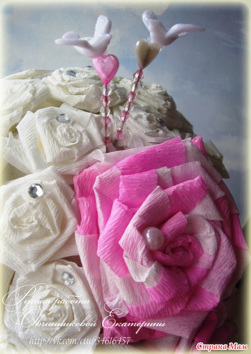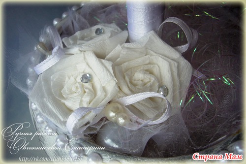 ленточки (сама увеличивала фото, чтоб вспомнить...) крепятся булавкой с жемчужной капелькой на конце + бусина + из этой же ленточки бантик наколотый на булавку = и этот "бутерброд" уже вкалывала в шар между цветочками...