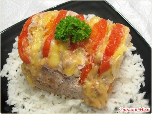 500 г свинины (лучше всего корейки), 200 г сыра, 300 г помидоров, 3 зубчика чеснока, соль, перец
