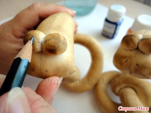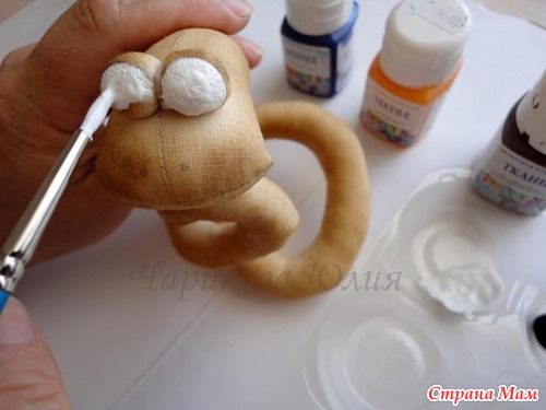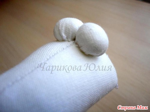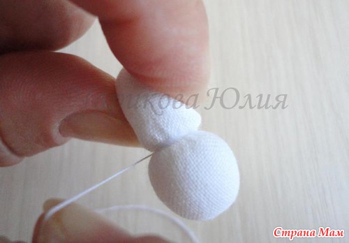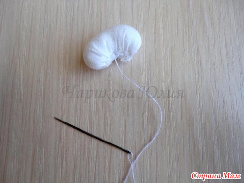 Теперь шьем глазки. Вырезаем небольшой овал из бязи. По кругу через край обшиваем ниткой, стягиваем, набиваем. Ещё раз туго стягиваем и зашиваем дырочку. Намечаем середину и делаем несколько витков ниткой туго стягивая. Получаются как бы два шарика.