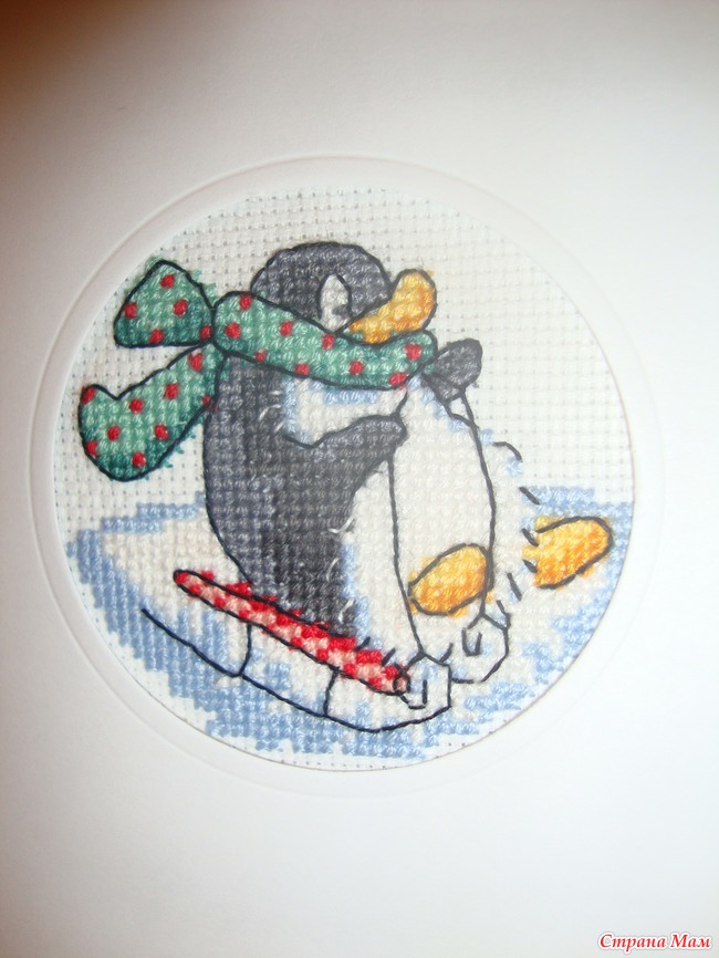 Схему брала из журнала "Вышиваю крестиком" № 12, ноябрь 2012. Там несколько схем забавных пингвинов - на санках, лыжах, сноуборде, коньках. Но этот мне понравился больше всех. Потому что видно, что он маленький, что ему страшно, но он все равно едет с горы. А когда спустится, будет страшно горд и счастлив! Так, наверное, и надо: часто бывает страшновато делать что-то новое, но потом, как правило, получается хорошо. Желаю нам всем быть такими пингвинами в новом году и ничего не бояться!