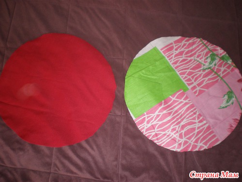 1) Вырезаем два круга - из красной ткани и из любой другой (она будет внутри мешка)