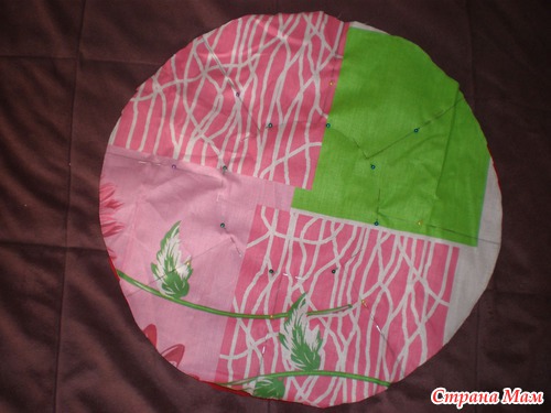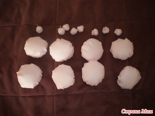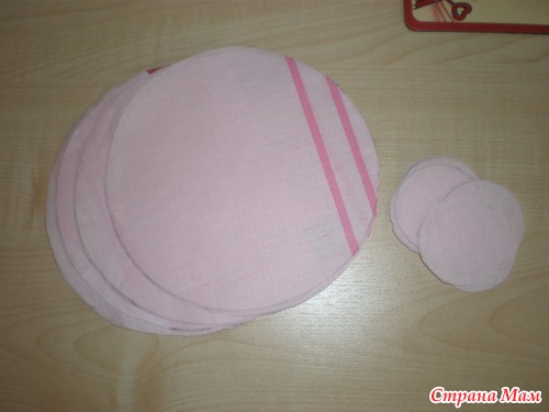 6) Дальше делаем рожицы. Берем розовую ткань и вырезаем восемь кружков. Диаметр равен ширине "кармашка" умноженной на два. И восемь кружков поменьше - это будут носики