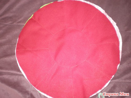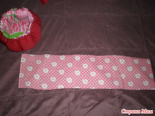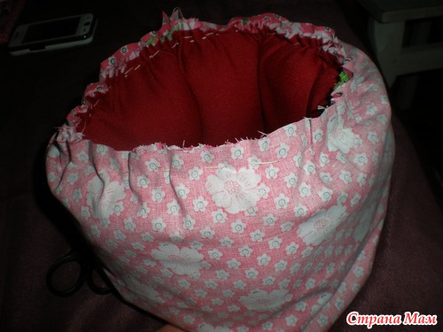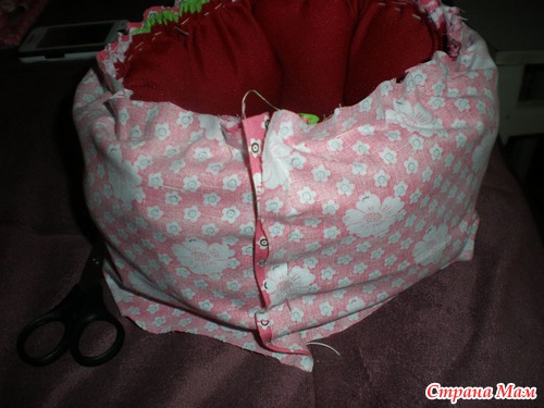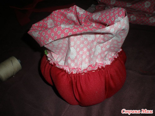 Выворачиваем нашу бочку АККУРАТНО чтобы не порвалась нитка, которой мы ее стягивали, прикладываем к верху нашу полоску ткани лицом к лицу