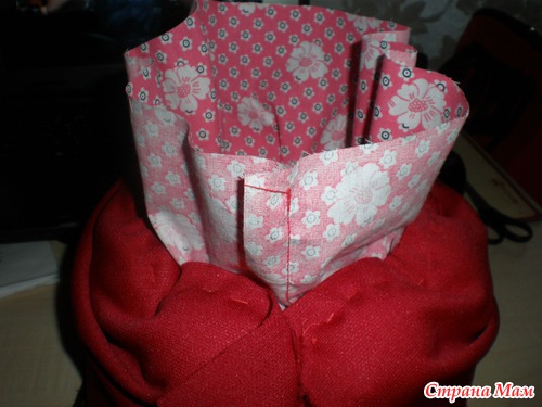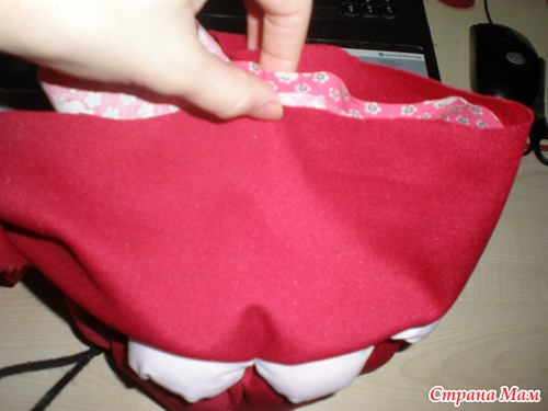 Поднимаем вверх внешний красный слой и обрезаем его по высоте и ширине, так чтобы он по верху совпадал с внутренним и зашиваем боковой шов аккуратненько на красном слое.
