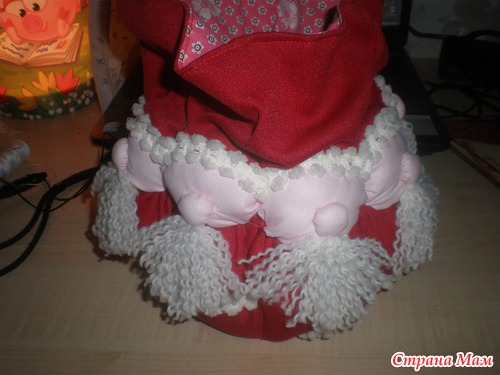 7)Берем шарики побольше и пришиваем их к бочке, один шарик над каждым кармашком