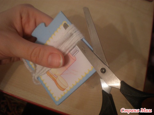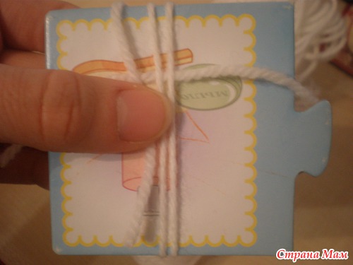 Потом начинаем наматывать на картон нитку, в этом мешке я делала 8 витков, в первом - 15 (он побольше)