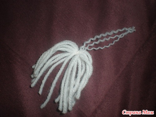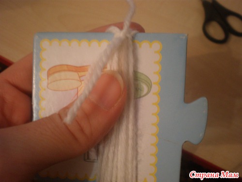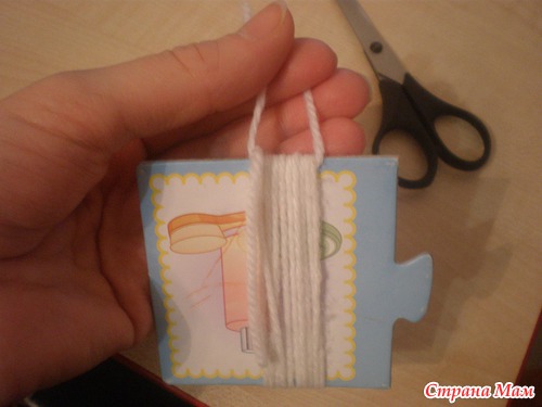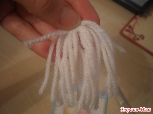 Хорошо что она не вначале, а то я бы не сшила даже первый мешок. Берем пряду белого цвета и кусочек картона. Ширина картона равна длине бороды.Отрезаем кусочек нити и кладем на картонку сверху