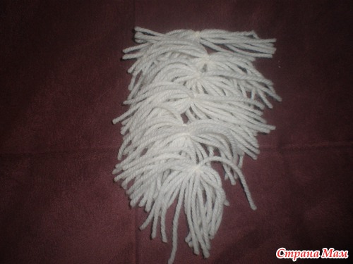 Хорошо что она не вначале, а то я бы не сшила даже первый мешок. Берем пряду белого цвета и кусочек картона. Ширина картона равна длине бороды.