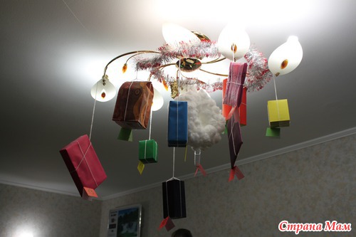 некоторые подарочки оформила в коробочках, и повесила на люстру