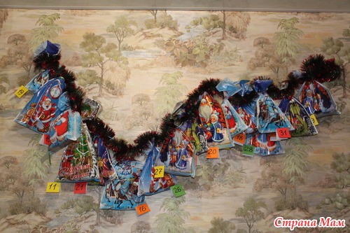 И вот в одну из бессонных ночей (чем ближе к родам, тем оных становилось больше) решила сделать следующее: накупила новогодних пакетиков и много маленьких подарков, расфасовала по пакетам и развесила на стене вместе с гирляндой