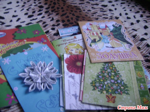 а вот общий вид сюрприза. Здесь книжечки для девочек моих, салфетки и ниточки для меня и новогодние наклейки