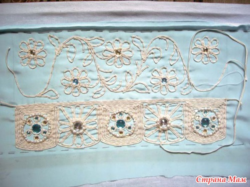 После чего с помощью шнура (сутажа) выкладывается по контуру, швом "вперед иголку" мелкими стежками.