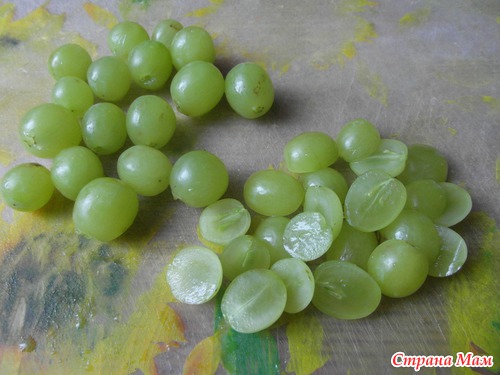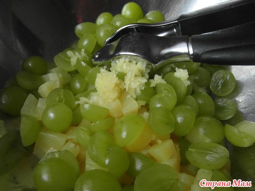 -сначала нарежьте ананас, виноград и оставьте стекать...