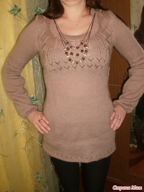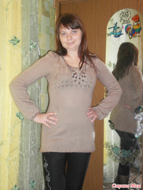 Вяжет кулинарную гладь, а рисунок (дырочки на моей тунике) делать надо с помощью деккера или с попеременным выводом игл в нерабочее и рабочее положение.