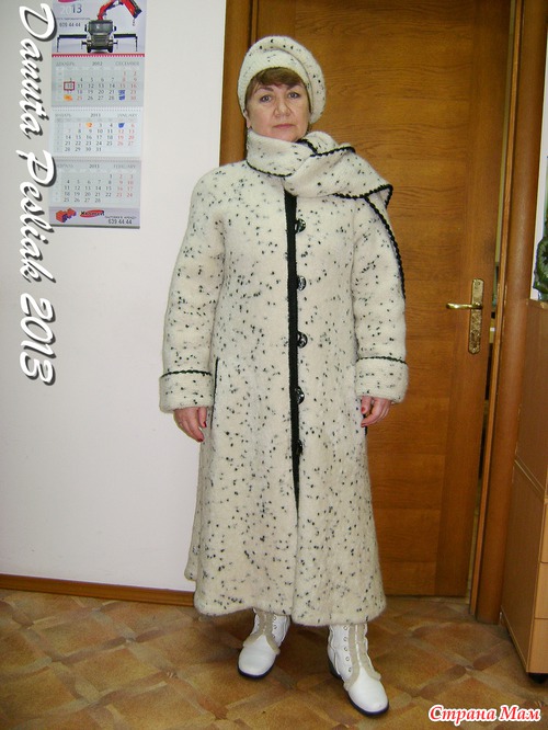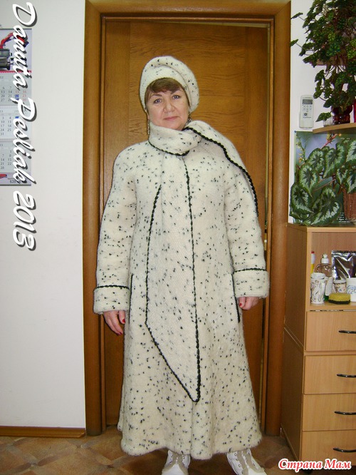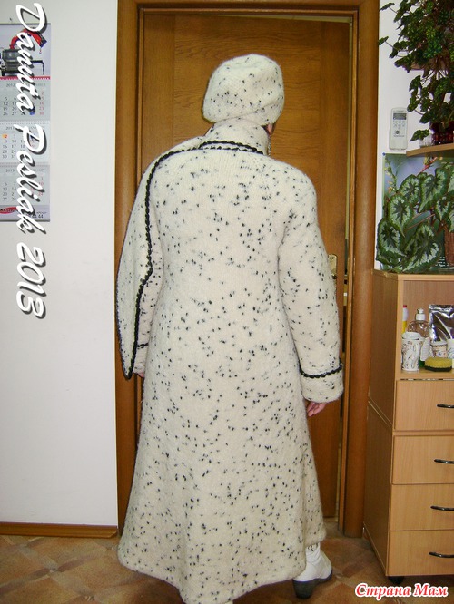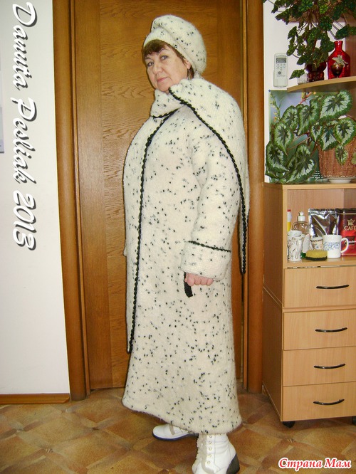 С Новым Годом всех, дорогие рукодельницы! Впервые выставляю на ваш суд свою работу: зимнее пальто и берет к нему. Честно говоря, боюсь что-нибудь сделать не так, как положено по правилам сайта... Комплект связан из 4-х тонких ниток неизвестного состава, буклированной структуры с черными вкраплениями и с небольшим содержанием лайкры. нитки покупала в магазине конфискованных товаров в бобинах. Спицы №3,5. Планка и обвязка краев выполнены крючком №2,5 из черных акриловых ниток в 2 сложения, чтобы планка была достаточно плотной и не растягивалась, петли - навесные. Обвязка края - пышные столбики с 4-мя накидами. Подкладка - стеганая на тонком синтепоне костюмная ткань. Связано сверху вниз лицевой гладью, только воротник-шарф и манжеты - платочной вязкой. Ниток ушло около 3-х кг. Но пальто получилось таким теплым, что, пожалуй, дубленка - холоднее... Простите, что сразу не разместила все фото: я только учусь.