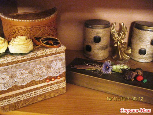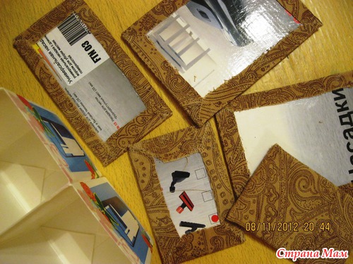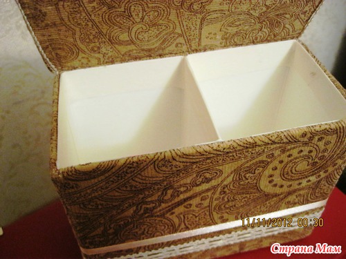 А еще в верхней части места срезов и соединения двух коробок проклеила малярным скотчем. Он как раз в цвет, не выделяется, зато края ровненькие получились.