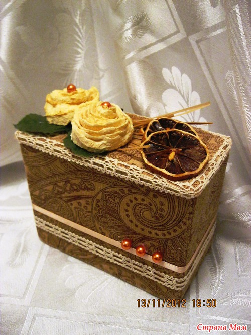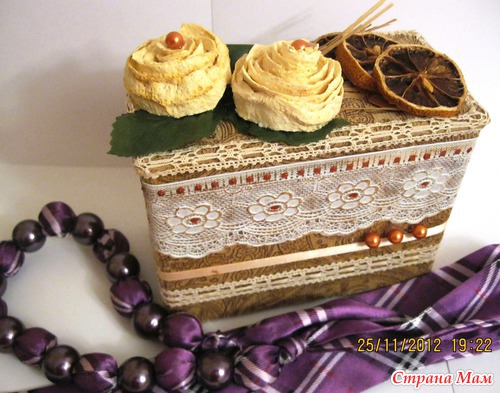 Какой прекрасный материал буквально валяется у нас под ногами. Я про пакеты от молока, сока и пр. Предлагаю вашему вниманию шкатулку из двух пакетиков и: цедры от помело, кусочков сушеного лимона, бусинок, кружева...