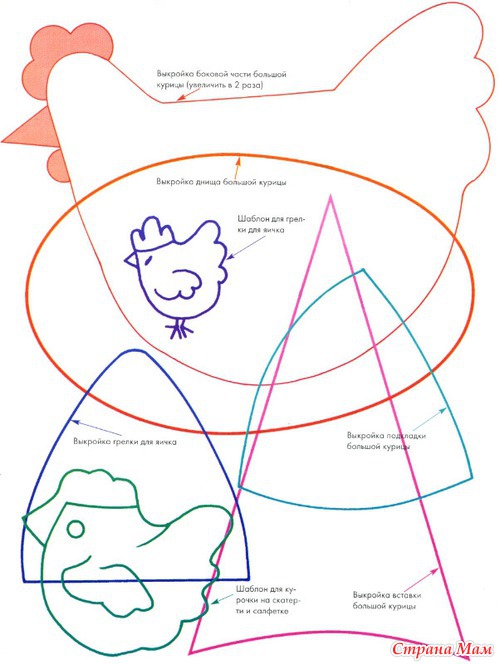 Вышивка: шов «гладь» полной нитью, шов «узелки» коричневой нитью в 3 сложения. Вышить курочку на всех трех деталях, отступив 2 см снизу. Гребешок, клюв и лапки вышивать нитью красного цвета, туловище – нитью белого цвета, а глаз – нитью коричневого цвета. Клетчатые детали сложить лицевыми сторонами и стачать. Лишние припуски на швы срезать и края обработать швом «зигзаг». Детали из флизелина стачать потайным швом и вставить в колпачок из клетчатой ткани. Нижний край грелки обработать двойной подгибкой шириной 1 см с подворотом внутрь на 0,5 см.