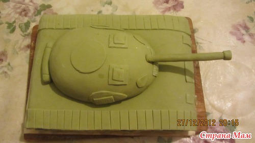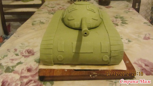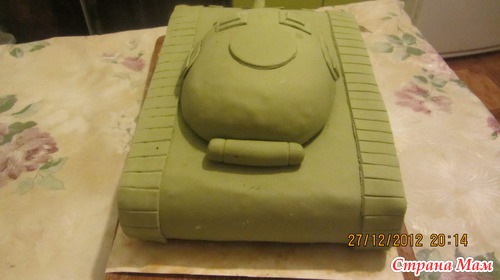 С Новым годом мои дорогие мастерицы!!! После пожара я не выставляла ни единого торта. Так что можно считать мой первенец! 28 декабря у моего любимого мужа День рождение и мне захотелось по-радовать его тортиком. Он у меня жуткий сладкоежка!!! Уже более 2 лет он играет в он-лайн игру World of Tanks. Поэтому у меня родилась идея сделать торт именно в виде танка. Как раз накануне он поздно пришел домой и я смогла сделать торт не заметно от него. Просмотрела я в инете очень много танков и мк, остановилась вот на этом мк: http://oede.by/publication/konditerskaya/masterklass_ot_dzhona_barshi_sladkij_tank_dlya_nastoyaschih_muzhchin/