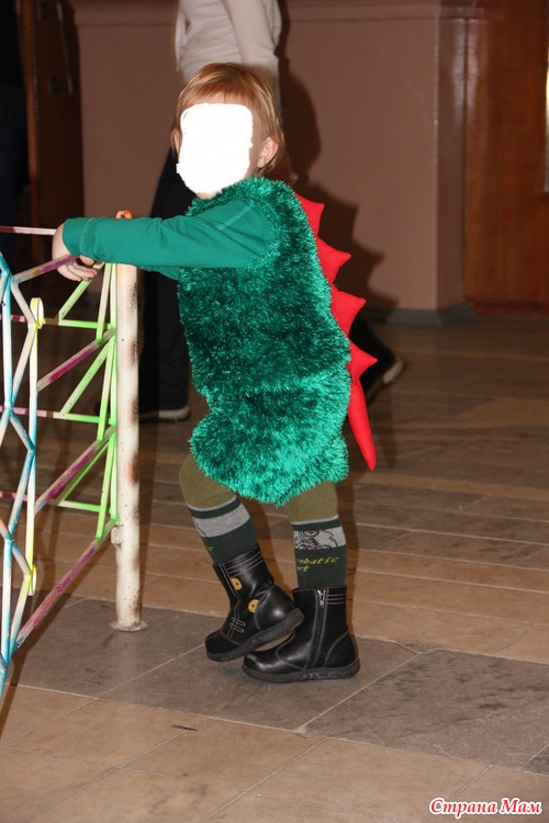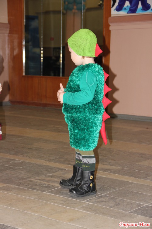 На нашу первую осознанную елке решила нарядить дите в костюм дракоши. Это моя первая работа спицами. Что-то тяжело они мне даются, но шортики с жилеткой связать получилось