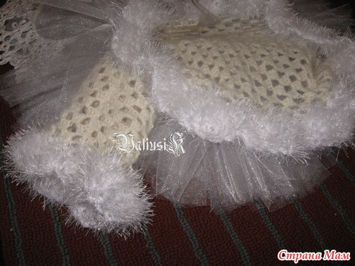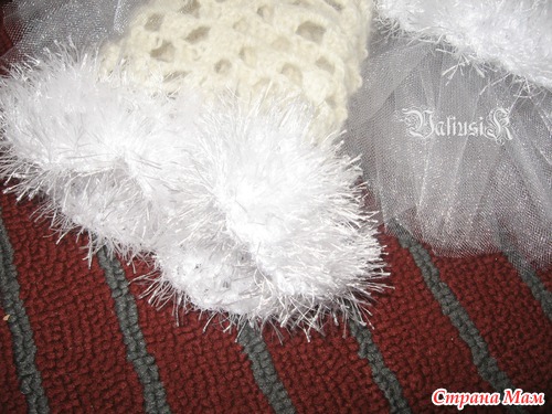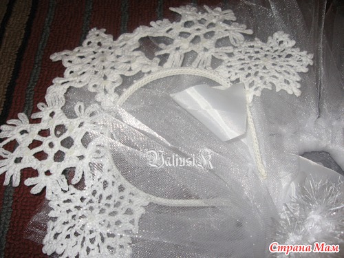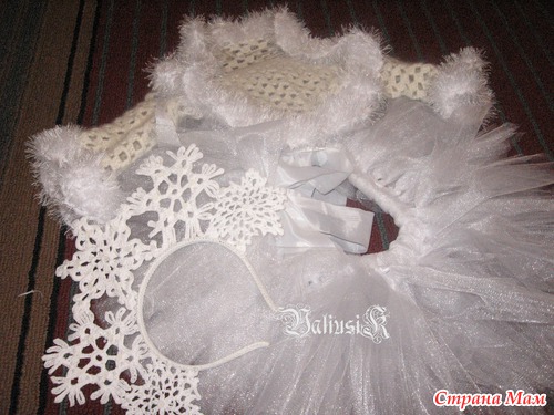 Долго расстраиваться из-за получившегося не по размеру костюма Маши -снегурочки https://www.stranamam.ru/post/4569264/ было некогда и мама(то бишь я) снова взялась за работу, а точнее за крючок. Сначала связалась корона, из отдельных элементов снежинок и обвязанного ободка (нить Санни от Ализе), потом была сделана юбка-пачка из фатина по принципу без машинки и швов и под конец связано болеро (точнее шраг) по этому посту https://www.stranamam.ru/post/1188620/ из лежавшей в закормах нитки, в составе которой одно знаю ангорская шерсть и обвязана Румбой от Ярн Арт. В комплект нашлась белая блузочка и колготки. А теперь фото