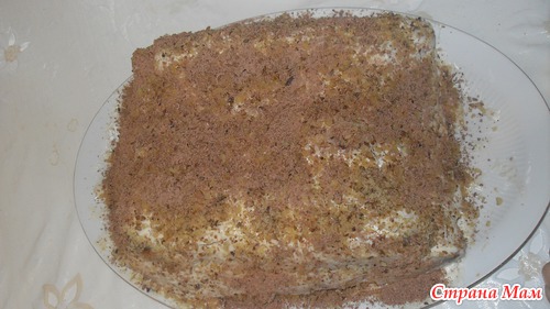 12. Готовую «избу» посыпьте оставшимися орехами и поставьте на холод на 24 часа. За меньшее время торт не пропитается.