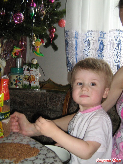 Сначала помогал перебирать гречку, пытался её попробовать, выплюнул, сказал "Бя"