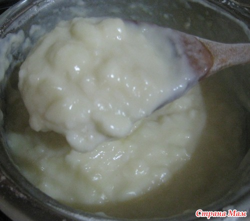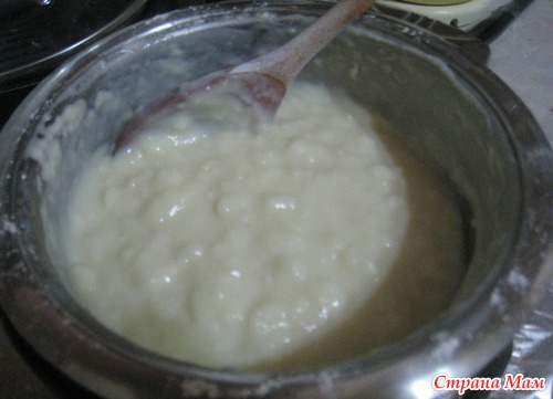 С огня снимаем и, добавляя муки понемногу, замешиваем тесто, чтоб от посуды отставало. Да, вначале трудно будет - тесто-то горячее