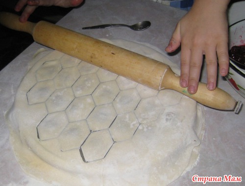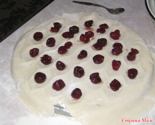 поэтому использую форму специальную да "рабсилу"Раскатала круг, на форму положила, вишенкой заполнили
