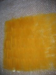 Я раскладываю шерсть на старой тюлевой занавеске синтетической, некоторые раскладывают на простыне сложенной вдвое, так чтобы оставалась свободной половина, которой накрывать: сначала разные нити или кусочки шерсти как в случае с мужским шарфом белые кусочки.