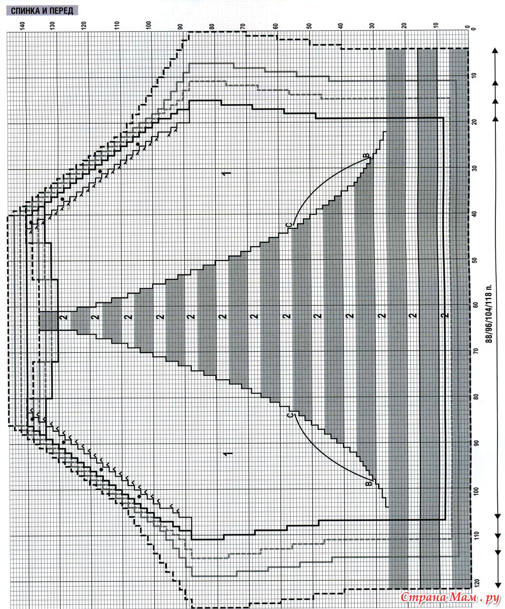 Набрать для Р1 88 п. Victoria, для Р2 96 п. Victoria, для РЗ 104 п. Angora super, для Р4 118 п. Angora super и вязать по схеме (первые 2 р. платочной вязкой). В 27-м р. схемы вязать резинкой 4/4 Aida, начиная для Р1 и РЗ с 2 лиц., для Р2 с 2 изн., для Р4 с 1 лиц. Карман: в точке В схемы оставить открытыми с каждой стороны по 9/13/17/24 п. и провязать 26 р. (до точки С) полосками Angora super и Victoria на 70 центральных п., убавляя с каждой стороны по схеме и оставив 40 оставшихся петель открытыми. Мешковина кармана: набрать по 9/13/17/24 п. оставленных открытыми с каждой стороны от центральной части из 70 п. Victoria (вводить спицу по изн. стороне в петли полотна) и вязать по схеме (центральная часть Victoria лиц. гладью вместо полосок Angora super и Victoria). В точке С обе части кармана расположить друг над другом и вводить спицу в 1 п. петлю каждой части), продолжить на всех петлях по схеме. Убавления реглана и «шишечки» выполнить, как на спинке.
