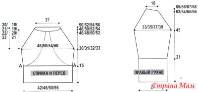 Набрать 53 п. Victoria, провязать 2 р. платочной вязкой, затем вязать *6 р. изн. глади Angora super, 4 р. лиц. глади Victoria*, повторить от * до * 4 раза и закончить 6 р. изн. глади Angora super, в послед- нем ряду прибавить 1 п. Продолжить Aida резинкой 4/4, начиная с 3 изн. Прибавить с каждой стороны для Р1 7 х 1 п. в каждом 8-м р., для Р2 10 х 1 п. в каждом 6-м р., для РЗ 6 х 1 п. в каждом 6-м р., 6 х 1 п. в каждом 4-м р., для Р4 15 х 1 п. в каждом 4-м р. Получим 68/74/78/84 п. На высоте 45 см вывязывать реглан по схеме. Выполнять реглан и «шишечки», как на спинке.
